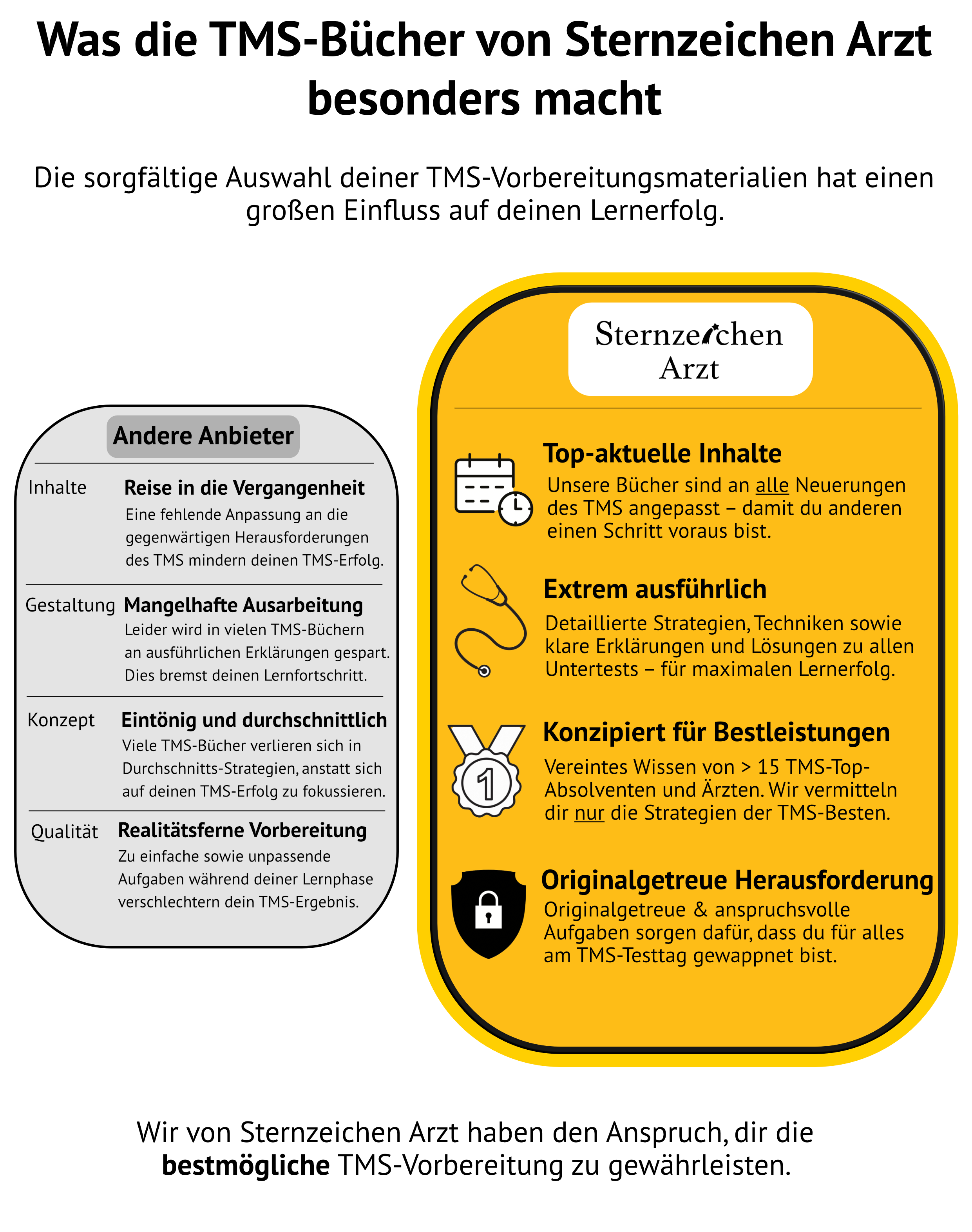 Bereite dich mit anspruchsvollen TMS-Büchern auf den TMS vor, damit du für ALLES gewappnet bist. Zu einfaches Übungsmaterial verhindert deinen Lernfortschritt und sorgt dafür, dass dich die anderen TMS-Teilnehmer einholen! Wir haben einige der besten TMS-Absolventen Deutschlands unterstützt – du kannst sicher sein, dass dich unsere TMS-Bücher herausfordern!