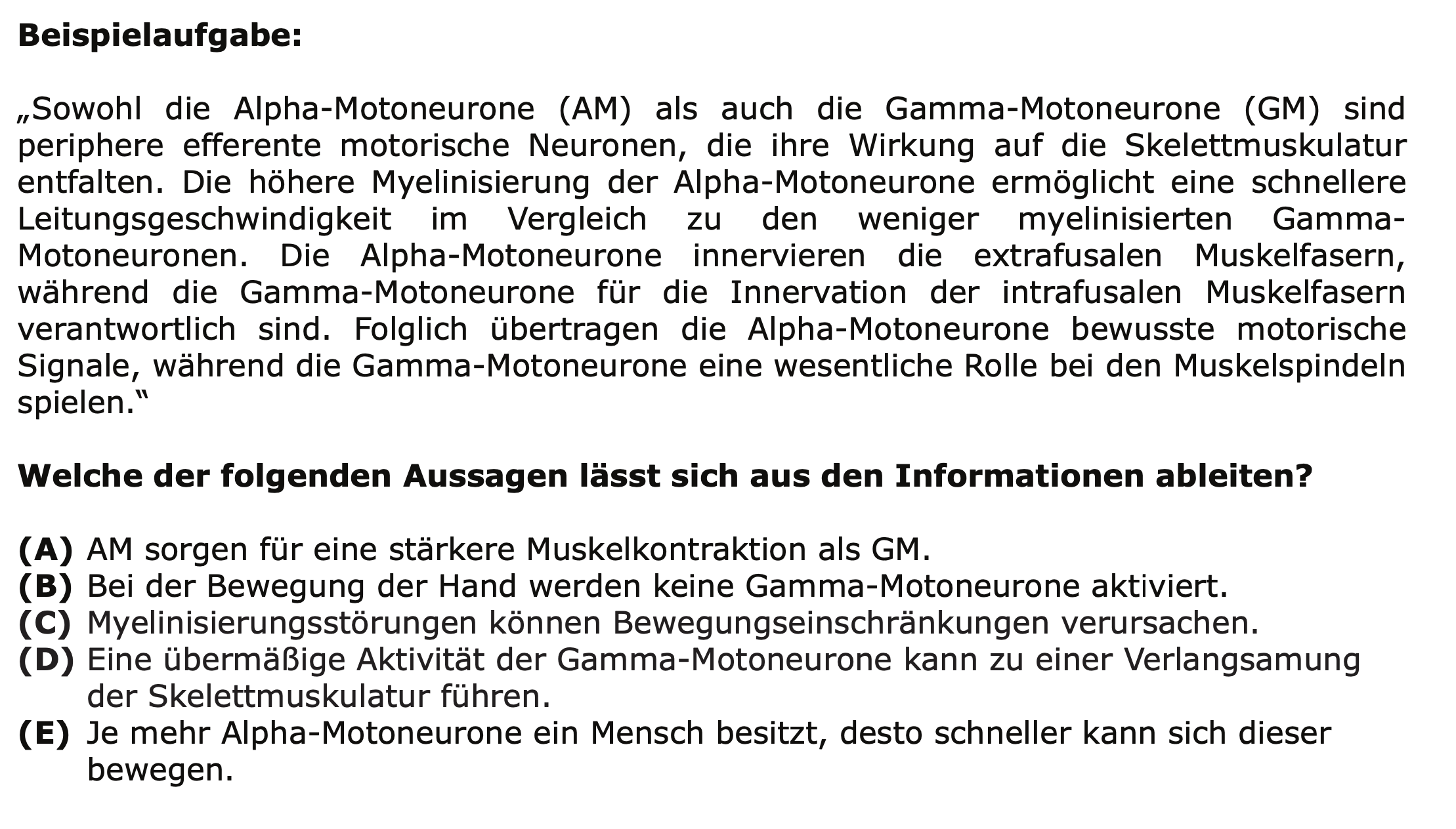 Bei diesem Untertest erhältst du einen kurzen Text (Länge: ca. 1/5 bis 1/3 einer DIN-A4-Seite) zu einem medizinischen oder naturwissenschaftlichen Sachverhalt. Im Anschluss folgt eine Frage mit mehreren Antwortoptionen. Deine Aufgabe besteht darin, die relevanten Informationen aus dem Text herauszuziehen und diese auf die gestellte Frage zu übertragen.