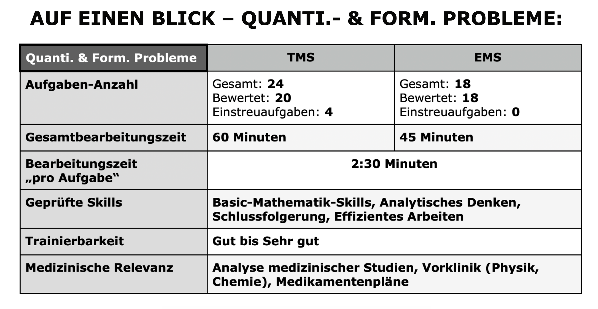 Im Untertest Quantitative & Formale Probleme werden deine Fähigkeiten im analytischen, mathematischen und logischen Denken geprüft. Der Untertest umfasst im TMS 24 Aufgaben, für die Bearbeitung stehen dir insgesamt 60 Minuten zur Verfügung – das entspricht rund 2:30 Minuten pro Aufgabe. Ein effizientes Zeitmanagement ist somit entscheidend.